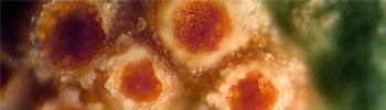 Sporenlager oder weiße Beläge auf Blättern, Nadeln, Lamellen oder Röhren.