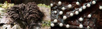 Überzüge, die sich über Moos zu bewegen scheinen, sehr kleine gestielte Keulen oder Kugeln